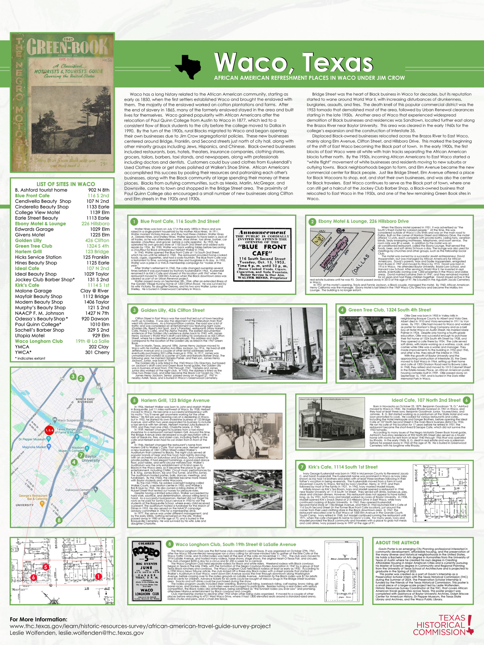 Preservation Scholar intern Gavin Porter, currently studying Community and Regional Planning for his Master’s degree at the University of Texas at Austin, selected Waco as his town and collaborated with the Dr Pepper Museum to research how Blacks, Hispanics, and Jews accessed soft drinks in Waco during the Jim Crow era (Summer 2024). He selected these sites for his poster:
